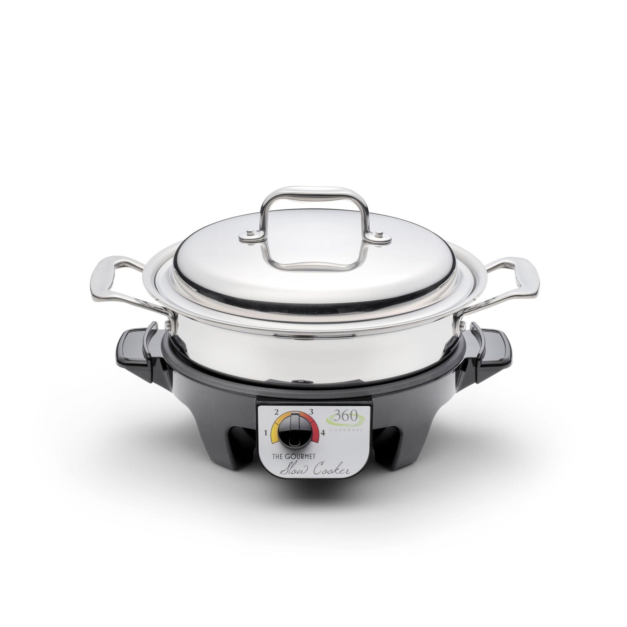 The 360 Cookware 2.3 Quart Slow Cooker Set includes a stainless steel casserole pan that is oven safe to 500°F and compatible with induction, gas, and electric stovetops, along with a countertop heating base for slow cooking and warming. Its cladded stainless steel construction delivers even heat, while Vapor® Cooking technology preserves nutrients and flavor. Free from PFAS, PFOA, lead, and cadmium, and handcrafted in the U.S.A., this compact set supports healthier cooking and reduces waste by replacing multiple single purpose appliances.
